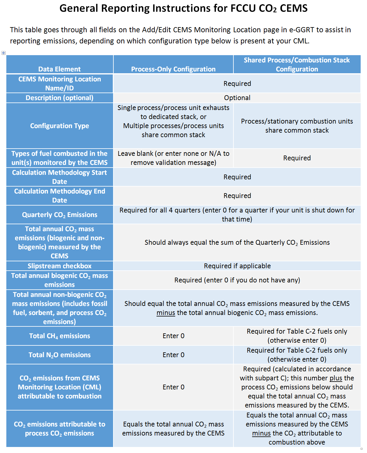 A656. EPA has prepared a general table of reporting instructions for FCC units with CEMs as presented in the table below. In addition EPA has provided guidance on how to report regenerator and process gas and explained how to avoid double counting of emissions in the following common situations: